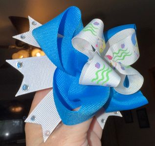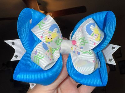 0 savesHand made twisted boutique bow. Larger blue bottom bow with a white bow that has mermaids. White bottom accent layer has a few rhinestones. On a silver clip.